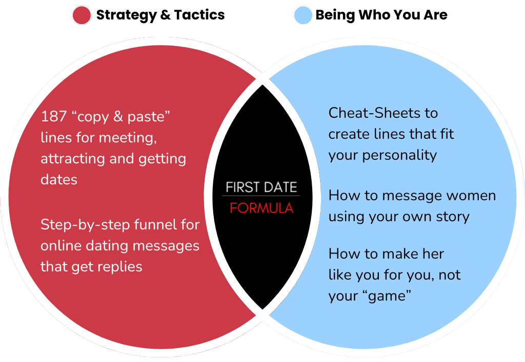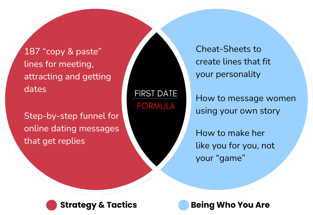 First Date Formula is a course with 187 proven lines and 5 authenticity principles that help you consistently get dates with high-quality women, by improving how you honestly express your real personality.
