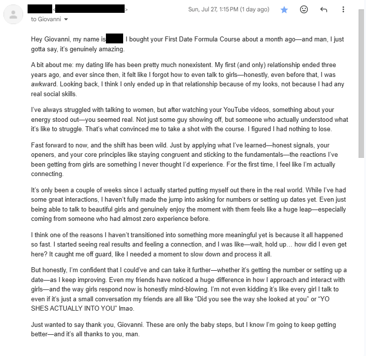 Will C.[This] helped me with understanding a structure and having a game plan to increase my attraction and connection [with women]... I really had no game plan before